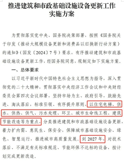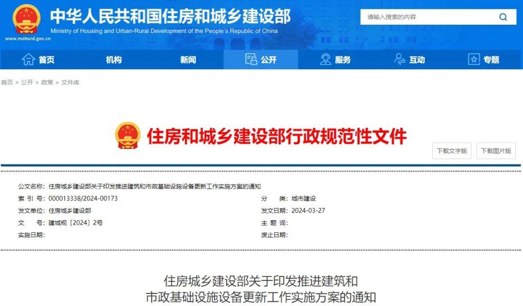 今年来,住建部发布了《关于印发推进建筑和市政基础设施设备更新工作实施方案的通知》,明确了未来三年的发展重点和方向,旨在推动设备更新工作的加快推进。根据方案要求,到2027年之前,将全面完成建筑和市政基础设施设备的更新工作。